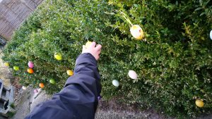 Sam hilft beim Ostereier aufhängen