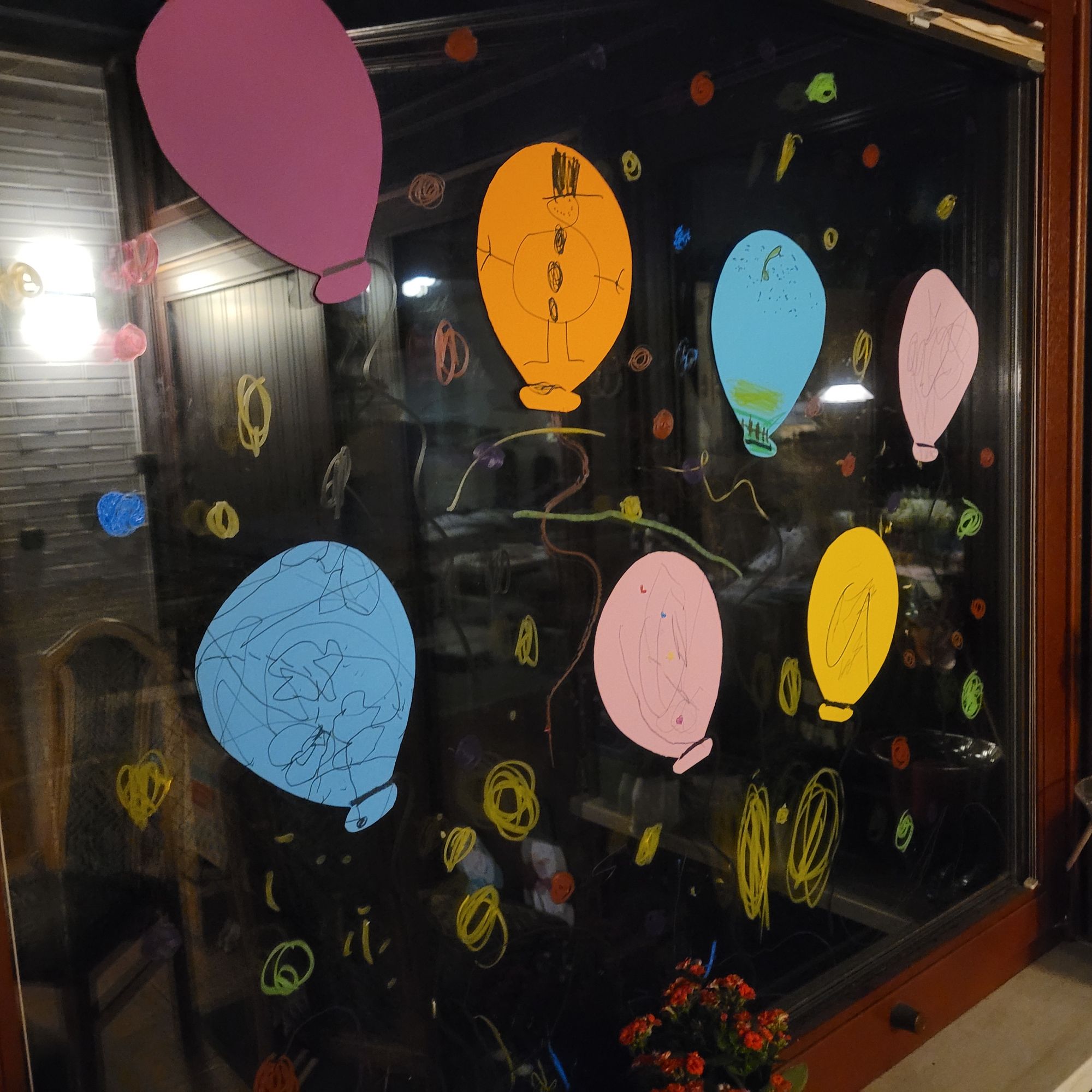 Fensterbild dunkel mit Luftballons und Konfetti